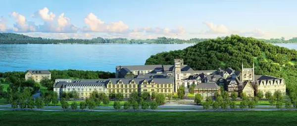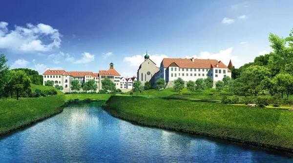 根據(jù)用地起伏、靠近松山湖水域的地理位置.點,結(jié)合瑞士.具歷史性的古城和修道院建筑,通過棕紅色瓦斜坡屋.和綠色砂巖外墻等.征,打造面向湖畔的斜面風(fēng)景.
