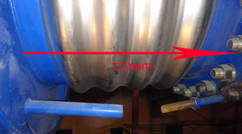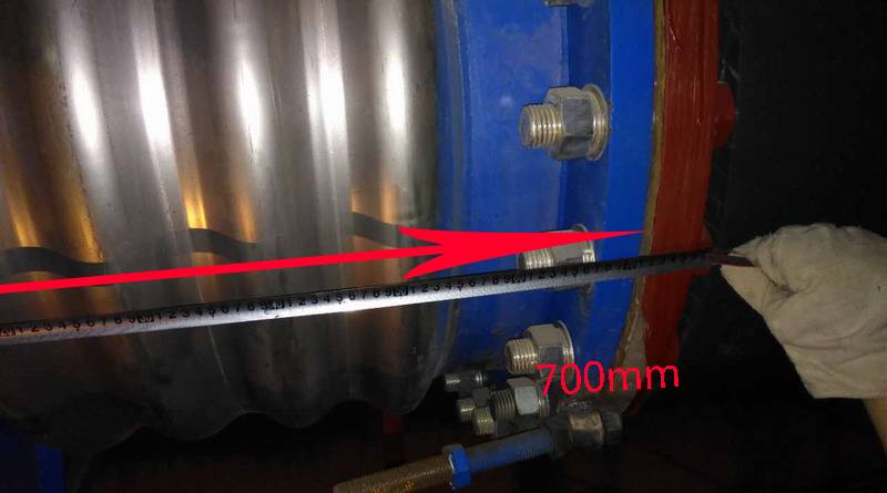 如上圖所示我廠生產(chǎn)出來DN800內(nèi)外壓平衡波紋補(bǔ)償器,外波那里的長(zhǎng)度是470mm。合同上面要求的拉長(zhǎng)量是50mm,這兩個(gè)數(shù)值加起來是520mm,也就是說伸長(zhǎng)到最大的長(zhǎng)度在520mm以內(nèi)可以正常使用(紅線位置)。