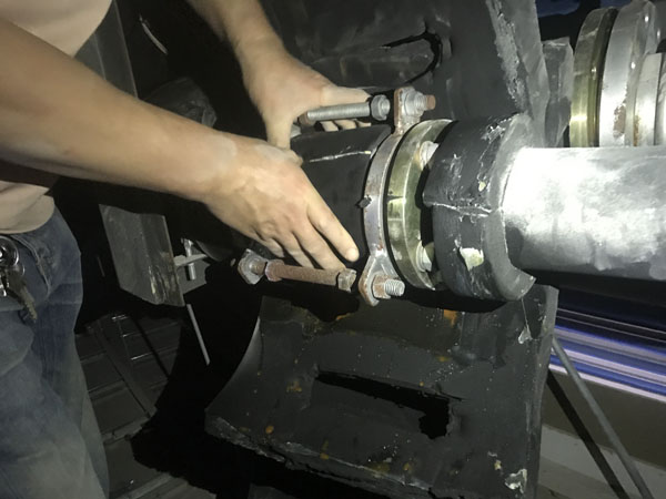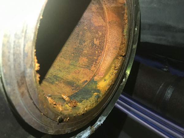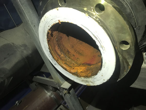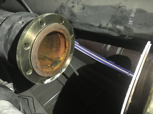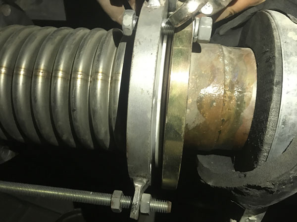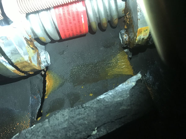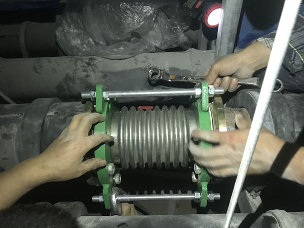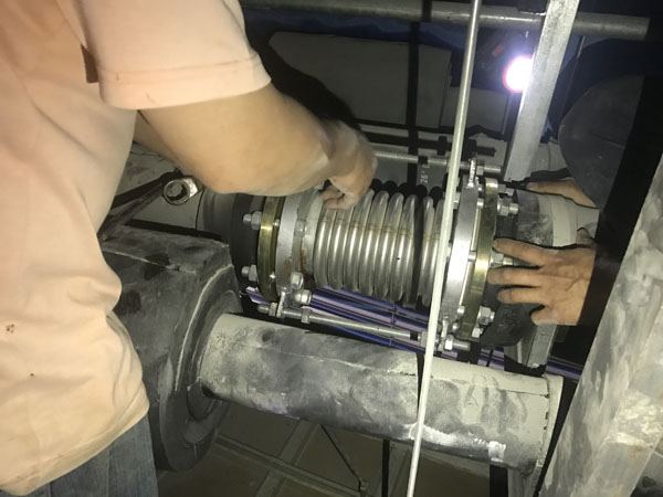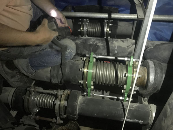 2018年6月1日上午客戶到我廠帶了一臺(tái)DN50波紋補(bǔ)償器,不銹鋼波紋與法蘭焊接處出現(xiàn)腐蝕漏水現(xiàn)象,客戶說(shuō)現(xiàn)場(chǎng)還有一臺(tái)DN125的也出現(xiàn)了漏水情況,說(shuō)要帶一個(gè)去現(xiàn)場(chǎng)更換,我廠工作人員帶了一臺(tái)DN125的波紋補(bǔ)償器當(dāng)天趕到上海華山醫(yī)院工地現(xiàn)場(chǎng),當(dāng)天下午1點(diǎn)上班后與現(xiàn)場(chǎng)人員一起來(lái)到天花板上面的管線現(xiàn)場(chǎng),并把DN125漏水的那臺(tái)進(jìn)行拆卸更換,在拆卸過(guò)程中,我廠工作人員全場(chǎng)在場(chǎng),并拍了一些現(xiàn)場(chǎng)照片(見(jiàn)附件),DN125拆下來(lái)后發(fā)現(xiàn)也是不銹鋼波紋與法蘭焊接處腐蝕漏水?,F(xiàn)場(chǎng)使用的管線為全銅管線?,F(xiàn)場(chǎng)使用的墊片為四氟墊片。