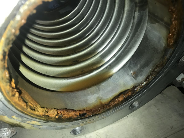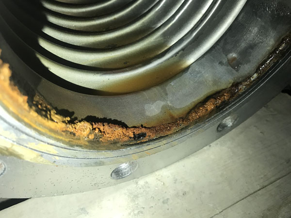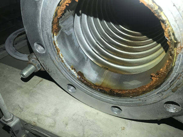 管道在正常運(yùn)行當(dāng)中,水里面的氯離子在管道中是流動(dòng)的,當(dāng)設(shè)備停止工作靜止?fàn)顟B(tài)下,空調(diào)水里面的氯離子會(huì)附著在波紋內(nèi)壁上,出現(xiàn)腐蝕。由于此種波紋補(bǔ)償器采用的是碳鋼法蘭,碳鋼法蘭與不銹鋼波紋焊接時(shí),焊接處最為薄弱,采用的壁厚是0.8mm,氯離子在焊接處內(nèi)壁上很快就把波紋焊接處腐蝕透。碳鋼法蘭與不銹鋼波紋焊接后的產(chǎn)品使用在:氯離子不超25mg/L。