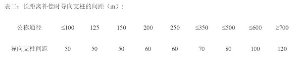 (2)BDXB系列旋轉(zhuǎn)補(bǔ)償器是一種全新的補(bǔ)償裝置,它的補(bǔ)償能力特別大,為此當(dāng)使用本補(bǔ)償器進(jìn)行長(zhǎng)距離補(bǔ)償時(shí)可按表二設(shè)置導(dǎo)向支柱。