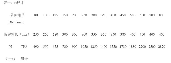 (1)Π型組合式補(bǔ)償器高H=旋轉(zhuǎn)筒長(zhǎng)+2×1.5DN,表一如下: