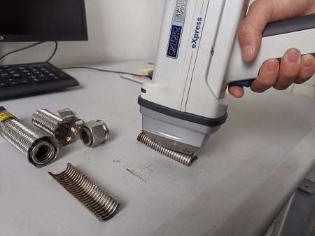 金屬軟連接切開(kāi)后,先對(duì)材質(zhì)進(jìn)行檢測(cè),我廠通過(guò)光譜儀對(duì)波紋材質(zhì)進(jìn)行檢測(cè),確保材質(zhì)達(dá)到8個(gè)鎳以上;