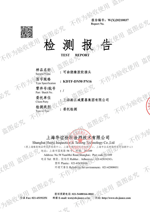 上海淞江減震器集團(tuán)有限公司官方網(wǎng)站為您介紹:【核電水電資質(zhì)】可曲撓橡膠接頭物料性能試驗檢測報告信息,淞江集團(tuán)為更多高標(biāo)準(zhǔn)項目提供可曲撓橡膠接頭產(chǎn)品,為了滿足客戶的各種性能指標(biāo),我廠生產(chǎn)高標(biāo)準(zhǔn)產(chǎn)品,以下是對我廠可曲撓橡膠接頭做的物理性能試驗,讓用戶放心使用。